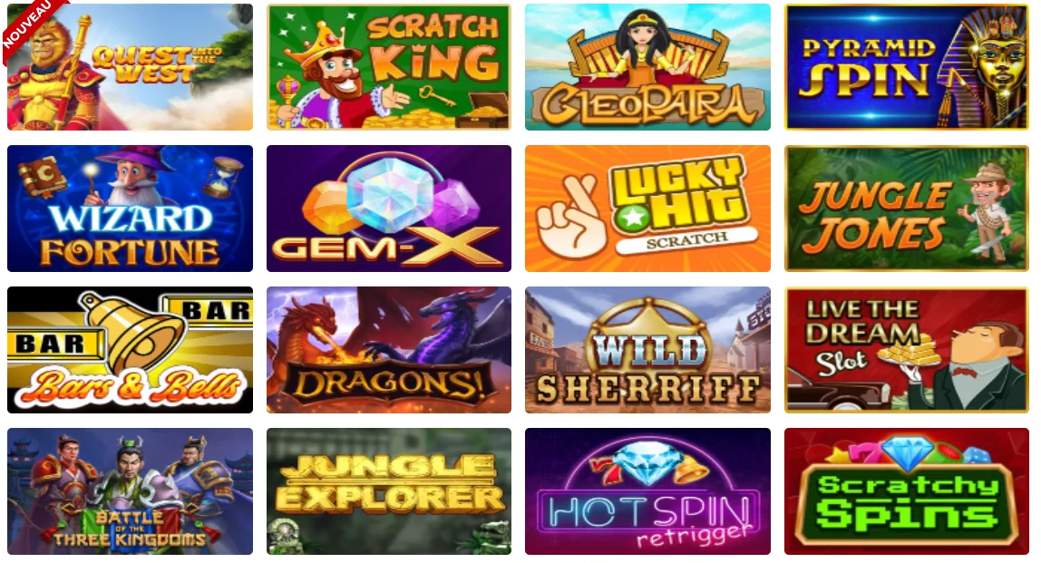 Lorsque j’ai exploré la ludothèque de Gratorama, j’ai vite compris que l’accent était mis sur les jeux à gratter, un segment très peu représenté ailleurs. J’ai testé une bonne dizaine de ces jeux, et je dois dire que certains sont franchement addictifs. On gratte virtuellement avec la souris ou en mode tactile, et chaque jeu propose des univers visuels différents : de la chasse au trésor aux animaux exotiques, en passant par des thèmes de science-fiction ou de fêtes traditionnelles. Il y a un vrai effort de mise en scène, même si graphiquement ça reste assez basique.